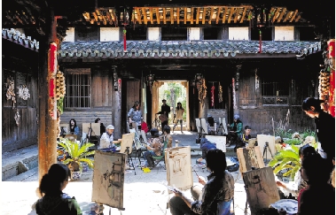10月19日,来自杭州吴越画室的50多名美术生正在丽水莲都古堰画乡的老房子里写生。每年的秋季是画乡最美的季节,也是各地美术生来写生最多的季节。