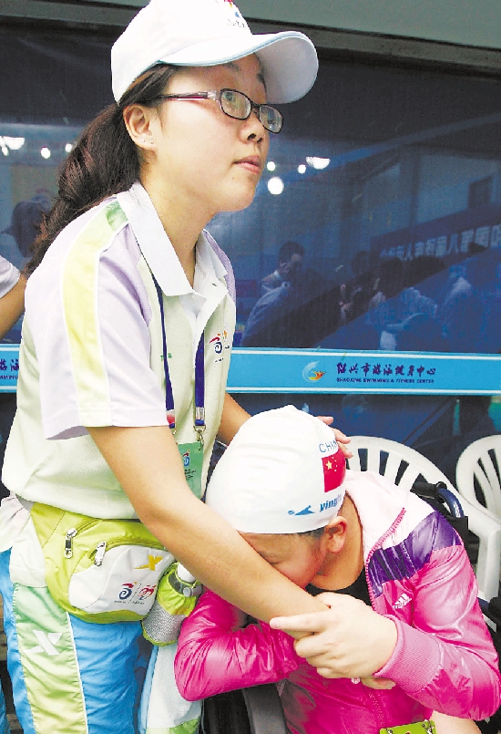 在游泳比赛中,贵州游泳运动员李灿与她朝夕相伴的志愿者田佳英亲如姐妹。 本报记者 吴煌 摄