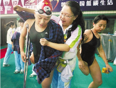 流动志愿者热情地帮助游泳运动员披上毛巾。 本报记者 吴煌 摄