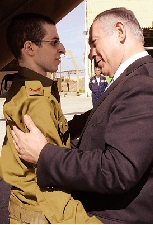 10月18日,以色列总理内塔尼亚胡(右)在以色列泰勒诺夫空军基地与获释的以色列士兵沙利特交谈。