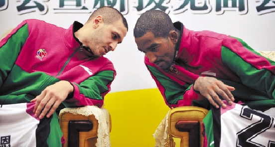 史密斯(右)在发布会上与队友约什·布恩交谈。 新华社发