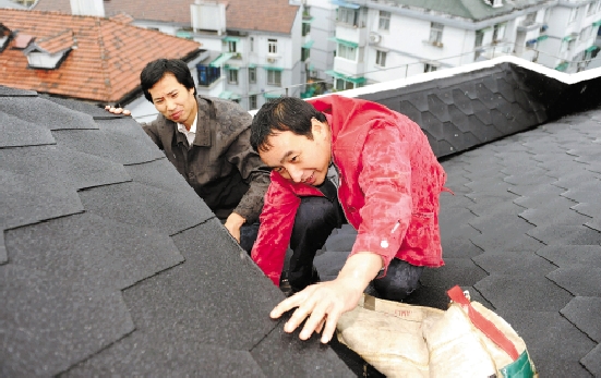 10月24日,杭州市紫阳街道邻里服务中心正式为辖区居民提供服务,主要负责为缺少物业管理的老小区提供房屋公共部分的小型维修,还推出社区便民食堂、社区保洁、保安等几项服务内容。有了这家“准物管”,老旧小区从“三不管”状态变成了“有人管”。图为服务中心的徐师傅和刘师傅在维修漏水的屋顶。 记者 梁臻 摄 |