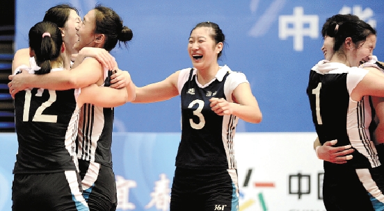 10月25日,温州队球员庆祝获胜。当日,在江西省宜春学院体育馆进行的第七届全国城市运动会排球女子U20决赛中,温州队以3比2战胜德阳队,获得冠军。 新华社发