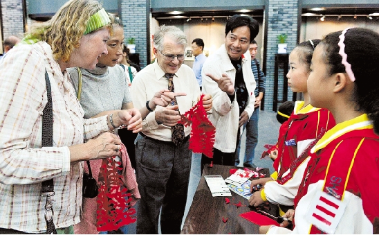 今年是中奥建交40周年,奥地利剪纸艺术展这几天在绍兴展出。奥地利剪纸大师的精品之作,生动反映了奥地利的历史风光和人文生态。图为绍兴小学生现场表演剪纸。 袁云 摄