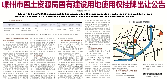 根据《中华人民共和国土地管理法》、《中华人民共和国城市房地产管理法》、《招标拍卖挂牌出让国有建设用地使用权规定》等法律、法规的规定,经嵊州市人民政府批准,我局定于2011年11月16日上午8时30分始至2011年11月25日下午4时止的工作日内,在嵊州市公共资源交易中心三楼交易服务区以挂牌方式出让下列一宗国有建设用地使用权。现公告如下: