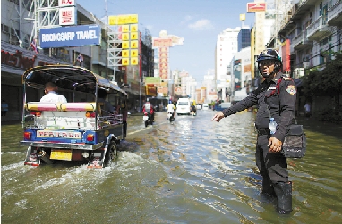 10月29日,在泰国曼谷,一名警察在被洪水淹没的道路上指挥交通。 新华社发