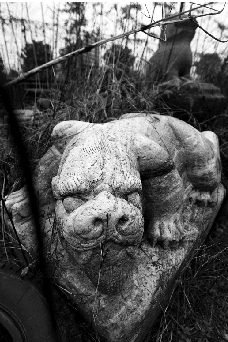 几年前,被遗弃在废墟荒草间的石兽。如今这尊石兽已被请到了新村落里最不可忽视的地方蹲着。