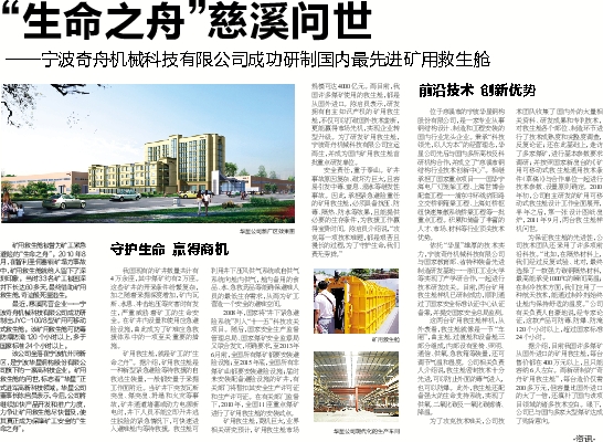 矿用救生舱,商机巨大,业界相关研究预计,矿用救生舱市场规模可达4000亿元。而目前,我国许多煤矿使用的救生舱,都是从国外进口。陈启员表示,研发拥有自主知识产权的矿用救生舱,不仅可以打破国外技术垄断,更能赢得市场先机,实现企业转型升级。为了研发矿用救生舱,宁波奇舟机械科技有限公司应运而生,并成为国内矿用救生舱首批重点研发单位。