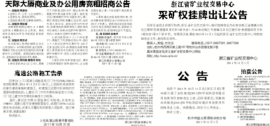 经浙江省国土资源厅批准,浙江省矿业权交易中心组织挂牌出让舟山市定海区金塘镇大观社区樟树岙普通建筑用石料(凝灰岩)、舟山市定海区岑港镇马目社区壁石岩普通建筑用石料(凝灰岩)等2个采矿权。有意竞买者请自2011年11月1日起到浙江省矿业权交易中心购取挂牌出让文件,查阅相关资料。
