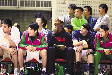 | 10月31日晚,浙江稠州银行队与美国芝加哥旅行者队在嘉善热身。本场比赛前NBA掘金队球员J.R.史密斯(中穿黑衣者)因伤没有上场,而是在替补席上用平板电脑玩起当天新开的微博,开设微博半个多小时,就拥有了近2000名“粉丝”。 胡凌翔 摄 |