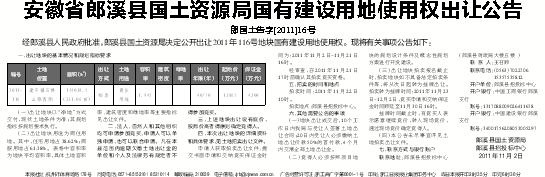 经郎溪县人民政府批准,郎溪县国土资源局决定公开出让2011年116号地块国有建设用地使用权。现将有关事项公告如下: