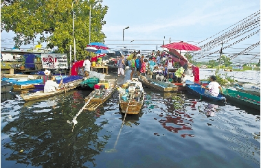 11月5日,曼谷洪水淹没的街道上,居民乘船前往配给点领取食物。 新华社发