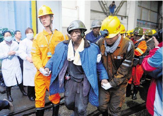 11月5日晨,获救矿工正在升井。 新华社发