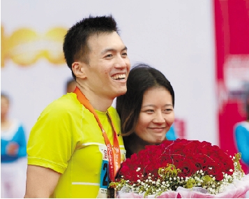 在比赛终点,20328号选手瞿晓刚跑完全程后向恋人傅峥文求婚。 汪开敏 摄