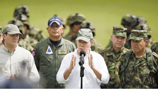 11月5日,哥伦比亚总统桑托斯在西南部考卡省首府波帕扬发表演讲,敦促“哥武”放下武器,自行解散。 新华社发