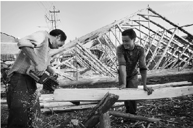 随着旧村改造不断推进,松阳农村的房屋建筑结构也发生了很大的改变,一种以木制结构房顶代替混凝土的建筑形式在农村流行起来。木材作为一种天然、健康的建筑材料,其保温性能是普通混凝土结构房顶的16倍,更是钢材的400倍,这种既经济又环保的木桁架正成为农村建房户的新宠。图为松阳西屏镇瓦窑头木材加工厂工人正在加工木桁架。 阙献荣 摄 |