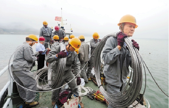 台州市路桥区供电局20余名外线作业员,近日来到远离大陆的黄礁岛,为岛上的渔民免费架设电缆,更换老化电线,安装新电表。路桥区供电局将投入2000万元,对岛上5个村120多户的电网进行全面改造。 王保初 摄