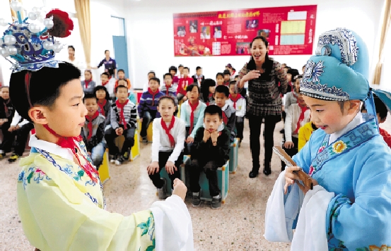 昨日,绍兴县中国轻纺城小学四年级学生韩梦莎(右一)正在戏曲课上示范越剧唱腔。今年9月份开学后,绍兴县推行地方戏曲进校园活动,全县10多万名中小学生都有了越剧等地方戏曲课。