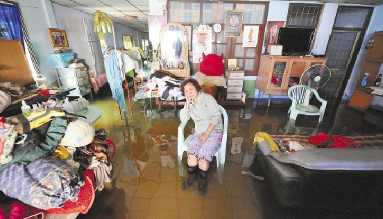 11月7日,在泰国曼谷,一名妇女坐在进水的房中,一筹莫展。 新华社发