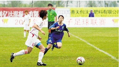 11月8日,2011年中国女子足球联赛嘉善赛区比赛继续进行,浙江杭州西子女子足球队(蓝)2比2战平陕西省女子足球队。另一场比赛长春华信大众女子足球队以5比1力克新疆女子足球队。 胡凌翔 摄