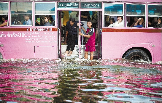 11月7日,在泰国首都曼谷,人们乘坐公交车经过已成“河道”的街道。 新华社发