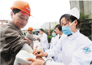 11月8日下午,台州市路桥区举行突发辐射环境污染事件应急演练,图为医疗救护人员为企业员工检测身体。 王保初 摄