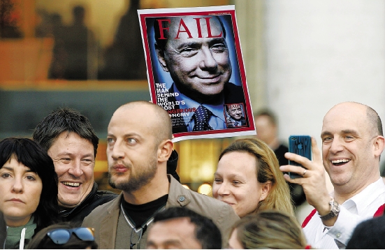 11月12日,在意大利首都罗马,一名市民在基吉宫外手举一页印有贝卢斯科尼头像和“失败”字样的杂志封面。 新华社发