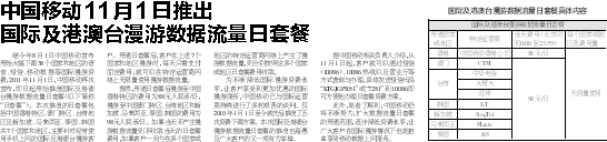 继今年8月1日中国移动宣布开始大幅下调38个国家和地区的语音、短信、移动数据等国际漫游资费,2011年11月1日,中国移动再次宣布,即日起开始推出国际及港澳台漫游数据流量日套餐(以下简称“日套餐”)。本次推出的日套餐包括中国香港特区、澳门特区、台湾地区及新加坡、马来西亚、泰国、韩国共7个国家和地区,主要针对经常使用手机上网的国际及港澳台漫游客户。开通日套餐后,客户在上述7个国家和地区漫游时,每天只需支付固定费用,就可以在特定运营商网络上无限量使用漫游数据流量。