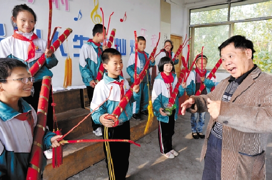 昨日,国家级非物质文化遗产传承人、曲艺家叶英盛,在义乌市畈田朱小学传授古老的“义乌道情”表演基本功。“义乌道情”是当地历史悠久的说唱曲艺。