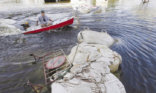 11月15日,在泰国首都曼谷廊曼机场附近,一名男子驾船经过沙包隔离带。一些泰国研究人员认为,大量洪水倾入泰国湾,可能导致海洋生态平衡遭到破坏。泰国自然资源和环境部官员米克民说,受洪水影响,鱿鱼、海鲶等数量的减少,导致鲸、海豚等生物的生存也受到威胁。 新华社发 |