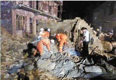 已致10死12伤 湖南省新邵县潭府乡跃进村11月14日19时40分许发生一起房屋垮塌致人伤亡事件。据新邵县官方提供数据称,现场8人死亡,至15日7时,2名重伤者经抢救无效死亡,另有12人受伤,目前均无生命危险。据了解,跃进村的村民们当晚在办理五保老人李国庆的丧事时,房屋突然垮塌,现场22名村民被掩埋。图为消防队员在对垮塌现场进行清理(11月14日摄)。 新华社发 |
