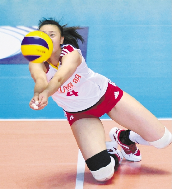 11月17日,中国队球员惠若琪在比赛中救球。当日,在日本东京举行的2011年女排世界杯第四阶段比赛中,中国队以3比0击败肯尼亚队。 新华社发