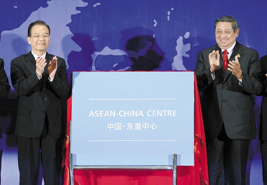 11月18日,国务院总理温家宝与东盟国家领导人共同在印度尼西亚巴厘岛出席中国—东盟中心揭牌仪式。右为印度尼西亚总统苏西洛。 新华社发
