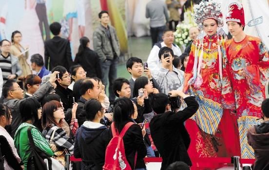 昨日上午,2011中国·长三角首届江南鸳鸯湖婚博会暨嘉兴市第五届婚庆产业博览会在嘉兴举行,60多家企业、商家纷纷展示了各自的特色服务和产品,其中尤以中式婚礼受青睐。 李剑铭 摄