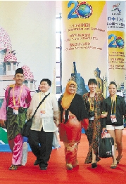 几位中国、东盟青年从庆祝中国-东盟建立对话关系20周年的宣传画前走过。
