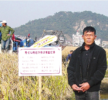 在2011年浙江农业吉尼斯水稻百亩示范方亩产纪录挑战赛中胜出的玉环城关农场农户柯荣光,与创纪录的百亩示范方稻田合影。