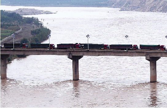 众多货车等候在兴神黄河大桥上(资料照片)。 新华社记者 陈建力 摄