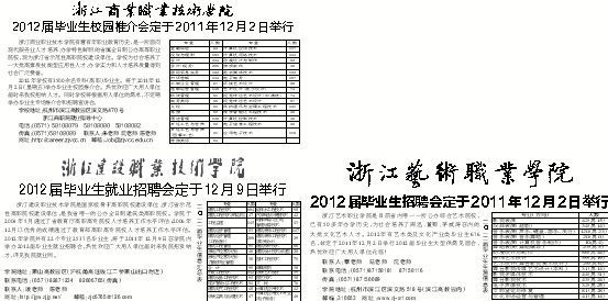 浙江艺术职业学院是目前省内唯一一所公办综合艺术院校,已有50多年办学历史,为社会培养了周迅、董卿、茅威涛在内的大批文化艺术人才。2012年有艺术类及文化产业类毕业生676名,兹定于2011年12月2日举行2012届毕业生大型供需见面会,热忱欢迎广大用人单位光临!