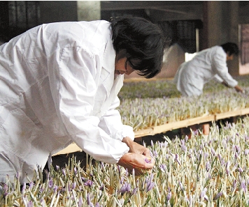 农业工人正在采藏红花蕊,之后要把藏红花株移栽到冬日空闲的稻田里。