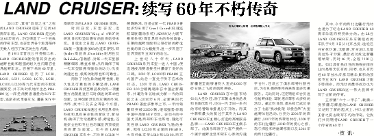 2011年,素有“四驱之王”之称的LAND CRUISER迎来了它的60周年华诞。LAND CRUISER走过的这60年时光,不但缔造了一个经典的传奇车型,也在世界各个角落陪伴无数人经历了难忘的生活点滴。