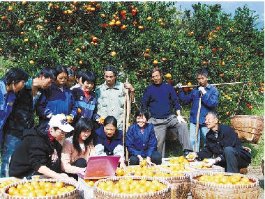 11月22日,建德市春江源村大学生村官汪辰东与叶芬在精品果园里和果农一起上网浏览当天全国蜜橘销售情况。为了帮助果农拓宽销售渠道,大学生村官在网上设摊,蜜橘销售供不应求。 宁文武 摄