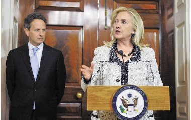 11月21日,在美国首都华盛顿国务院,美国国务卿希拉里·克林顿(右)和财政部长蒂莫西·盖特纳宣布对伊朗实施制裁的新措施。 新华社记者 张军 摄