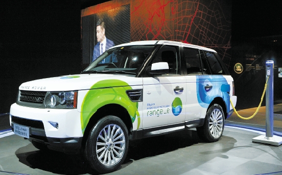 第九届广州车展22日在广州琶洲国际会展中心开幕,50多款新能源汽车竞相亮相,其中最引人注目的是电动汽车。图为车展上展示的一款路虎揽胜插电式混合动力车。 新华社发