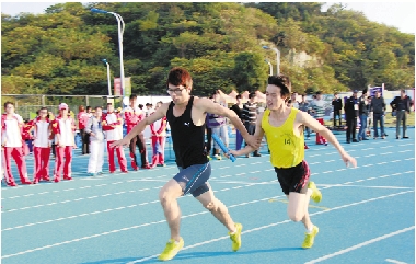 在台州学院举行的第十三届浙江省大运会,迎来了全省76所高校的90支代表队、1289名大学生运动健儿。24日,运动健儿进行正式比赛前的最后一次热身,熟悉比赛场地。图为参赛大学生在接力赛训练。 记者 洪卫 摄