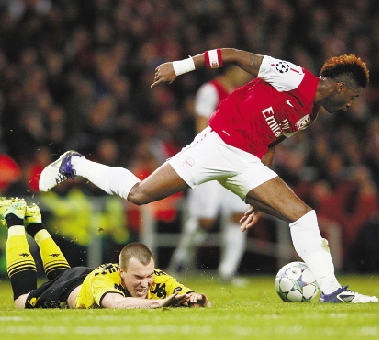 11月23日,阿森纳队球员宋(右)与多特蒙德队球员格罗斯克罗伊茨在比赛中拼抢。当日,阿森纳队在2011/2012欧洲冠军联赛小组赛第五轮比赛中,主场以2比1战胜多特蒙德队。 新华社发