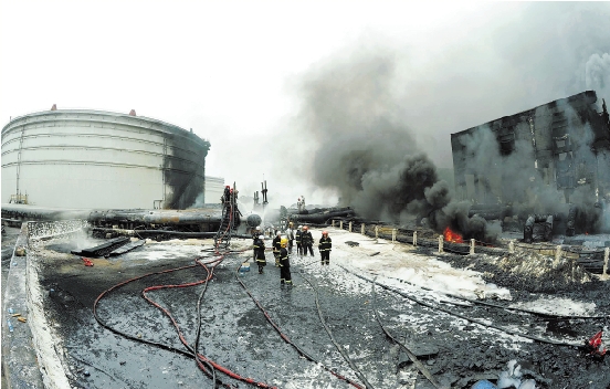 资料照片:2010年7月17日,消防人员在火灾现场扑救。 新华社发