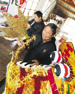 65岁的龙游县湖镇前文化馆长吕金贵,正在指导儿子扎龙灯。据了解,吕金贵是当地有名的龙灯艺人,衢州许多龙灯都出自他之手,甚至嘉兴、桐庐等地也来请他扎龙灯。吕金贵说,现在龙灯的用场越来越多,但很少有年轻人学这门手艺。