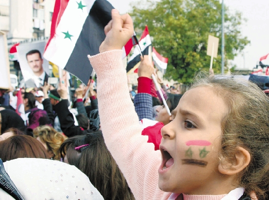 11月24日,在叙利亚首都大马士革,一个脸上画有叙利亚国旗的女孩参加声援政府的集会。 新华社发
