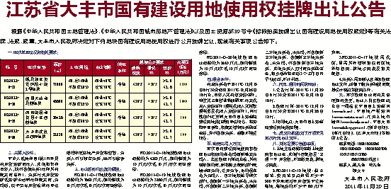 根据《中华人民共和国土地管理法》、《中华人民共和国城市房地产管理法》以及国土资源部39号令《招标拍卖挂牌出让国有建设用地使用权规定》等有关法律、法规、规章,大丰市人民政府决定对下列地块国有建设用地使用权进行公开挂牌出让,现就有关事项公告如下: