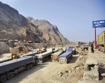 11月28日,北约补给车停在巴基斯坦多尔哈姆边境附近。当日,巴安全部队继续封锁北约前往阿富汗的供给线。 新华社发